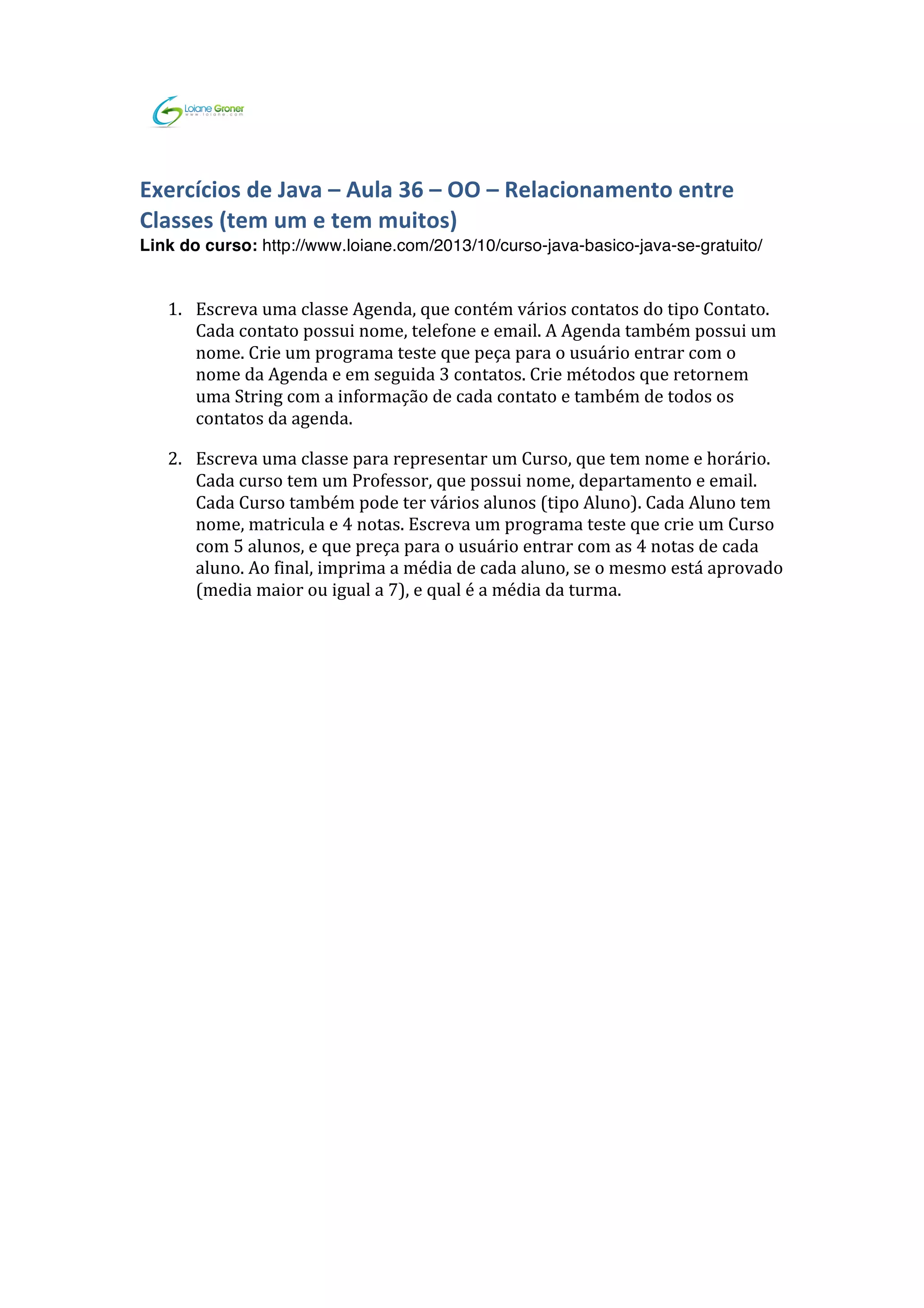 O documento descreve dois exercícios de programação orientada a objetos em Java. O primeiro exercício pede para criar uma classe Agenda com contatos e uma classe de teste. O segundo exercício pede para criar uma classe Curso com Professor e Alunos, e uma classe de teste.