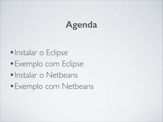 Este documento fornece instruções sobre como instalar as IDEs Eclipse e Netbeans para desenvolvimento em Java, além de links para o código-fonte e vídeos de um curso sobre Java básico.