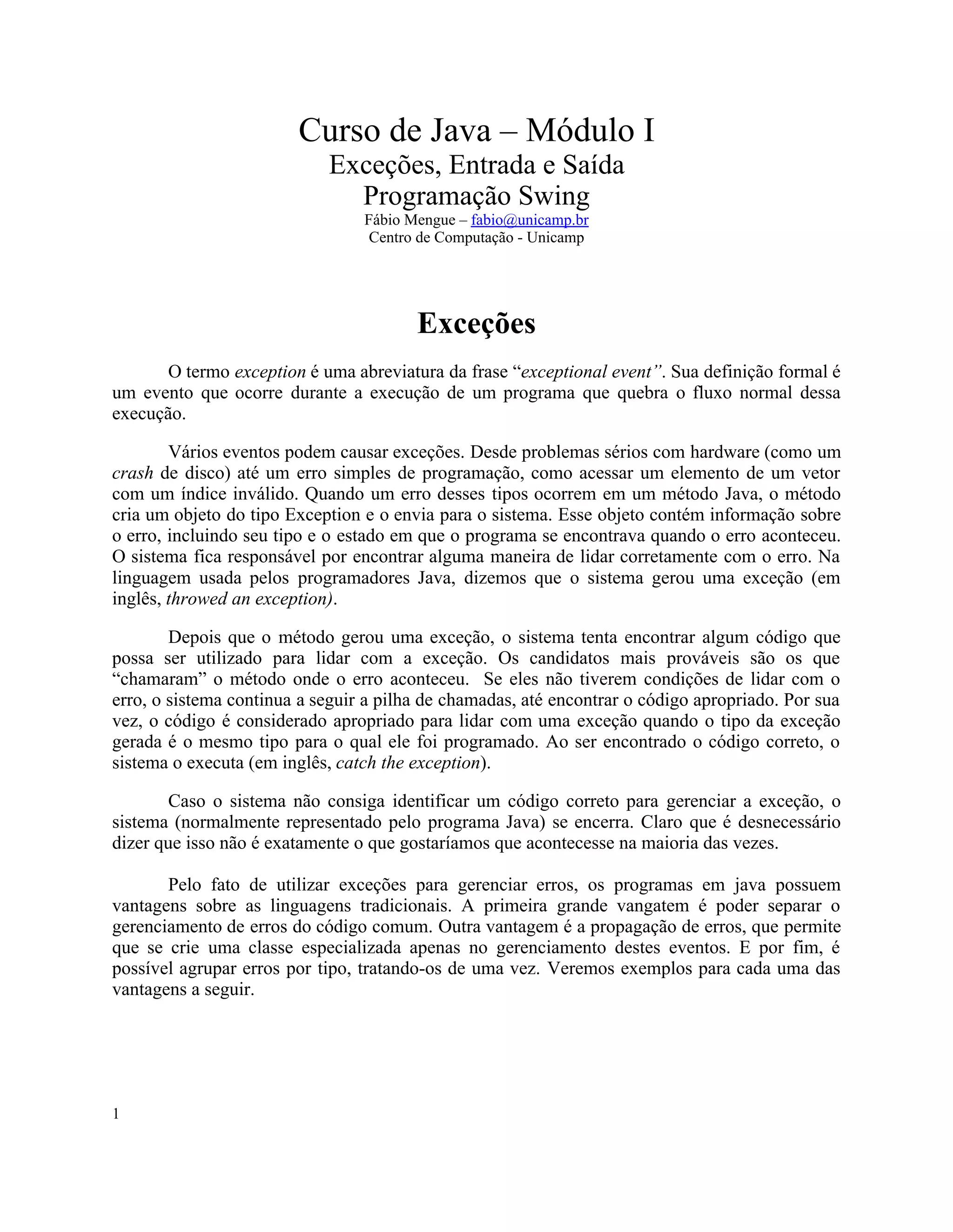 O documento descreve um curso de Java sobre exceções, entrada e saída e programação Swing ministrado por Fábio Mengue da Unicamp. A primeira seção explica que exceções ocorrem quando eventos inesperados quebram o fluxo normal de execução de um programa e que erros de hardware ou programação podem gerar exceções.