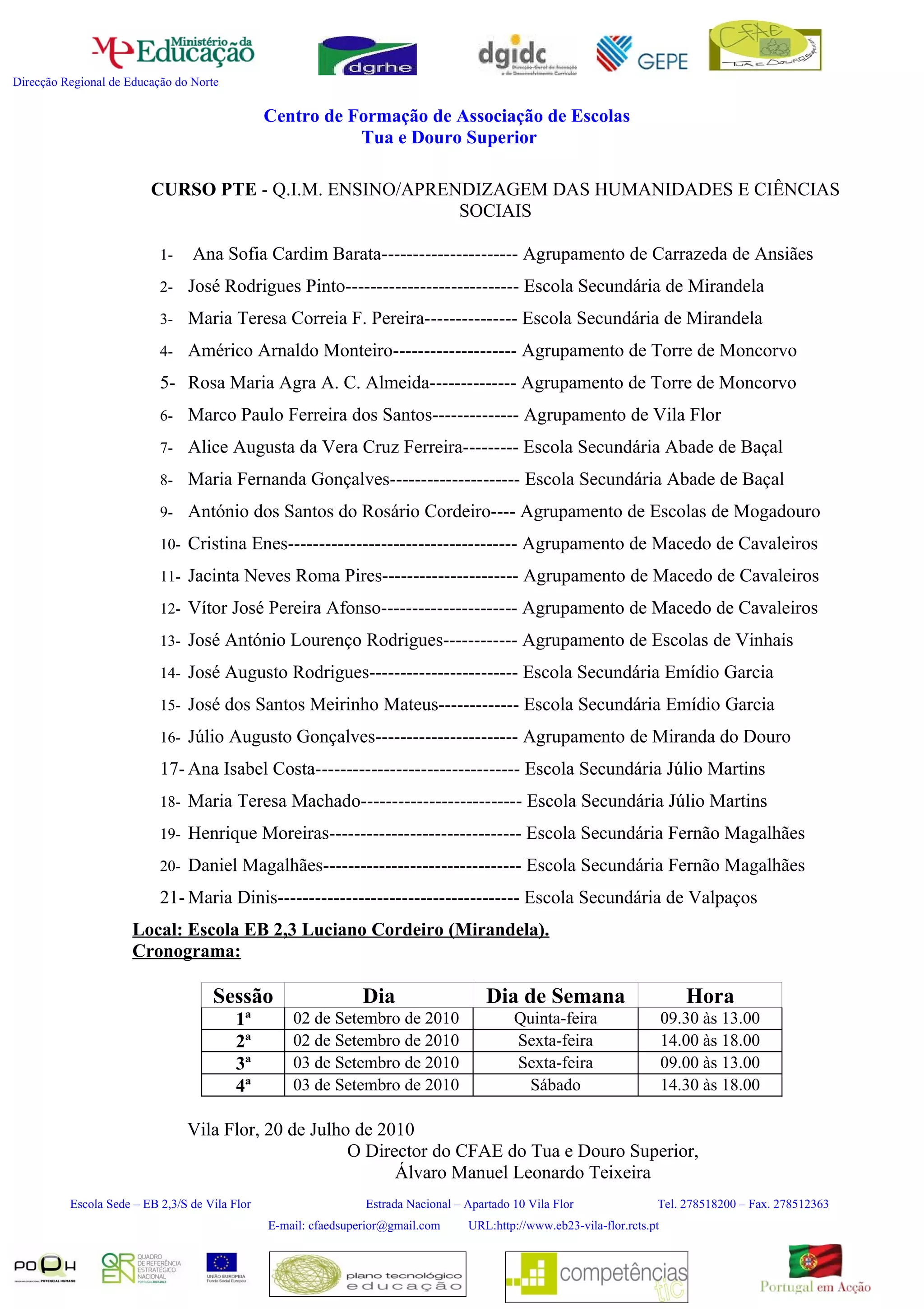 2. O curso será realizado na Escola EB 2,3 Luciano Cordeiro em Mirandela nos dias 2 e 3 de setembro de 2010 em 4 sessões.