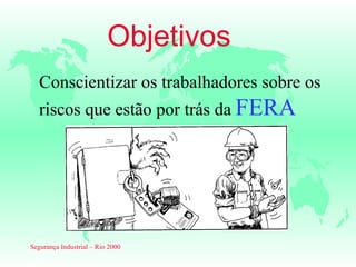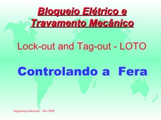 1) O documento discute os procedimentos de bloqueio elétrico e travamento mecânico (LOTO) para garantir a segurança durante trabalhos de manutenção. 2) Ele explica os cinco erros fatais que podem causar acidentes e os seis passos para realizar corretamente um bloqueio, incluindo desligar, isolar, bloquear, controlar energia residual e verificar o equipamento. 3) O objetivo é conscientizar trabalhadores sobre os riscos e ensinar como realizar bloqueios de forma segura.