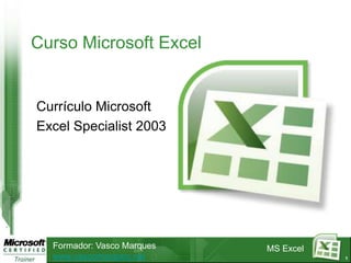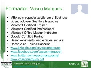 Este documento apresenta um currículo de formação em Microsoft Excel ministrado por Vasco Marques. O programa inclui tópicos como a criação e análise de dados, formatação, gestão de ficheiros, personalização e macros em VBA. O documento fornece também informações sobre o formador como sua formação acadêmica e certificações.
