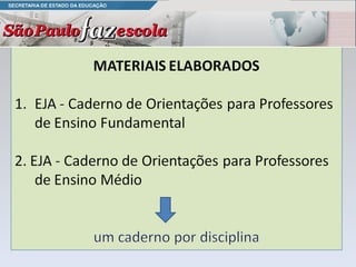O documento discute orientações pedagógicas para professores de Educação de Jovens e Adultos (EJA) no Brasil. Ele descreve os princípios e critérios para a seleção de conteúdos que levem em conta as especificidades dos alunos da EJA, como a contextualização e a valorização de experiências extraescolares. Também apresenta a estrutura básica dos cadernos de orientação para professores, com sugestões de atividades e referências.