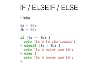 1) O documento apresenta exemplos de estruturas de controle e loops em PHP como IF/ELSE, WHILE, FOR, FOREACH e SWITCH.