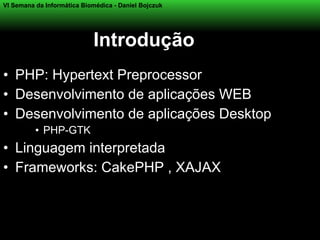 O documento apresenta uma introdução ao PHP, linguagem de programação usada para desenvolvimento web. Aborda conceitos como estrutura de código PHP, variáveis, constantes, arrays, operadores, estruturas de controle e formulários. Apresenta exemplos de código PHP para ilustrar cada tópico.