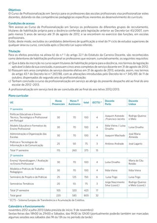 Este documento descreve um curso de profissionalização para professores de escolas profissionais em Portugal. O curso visa dotar os professores das competências pedagógicas necessárias para desenvolver o currículo, incluindo políticas educativas, modelos educativos profissionais e práticas de ensino. O curso ocorrerá de novembro de 2012 a julho de 2013 e inclui aulas presenciais e trabalho autónomo. As inscrições estão abertas até outubro de 2012.