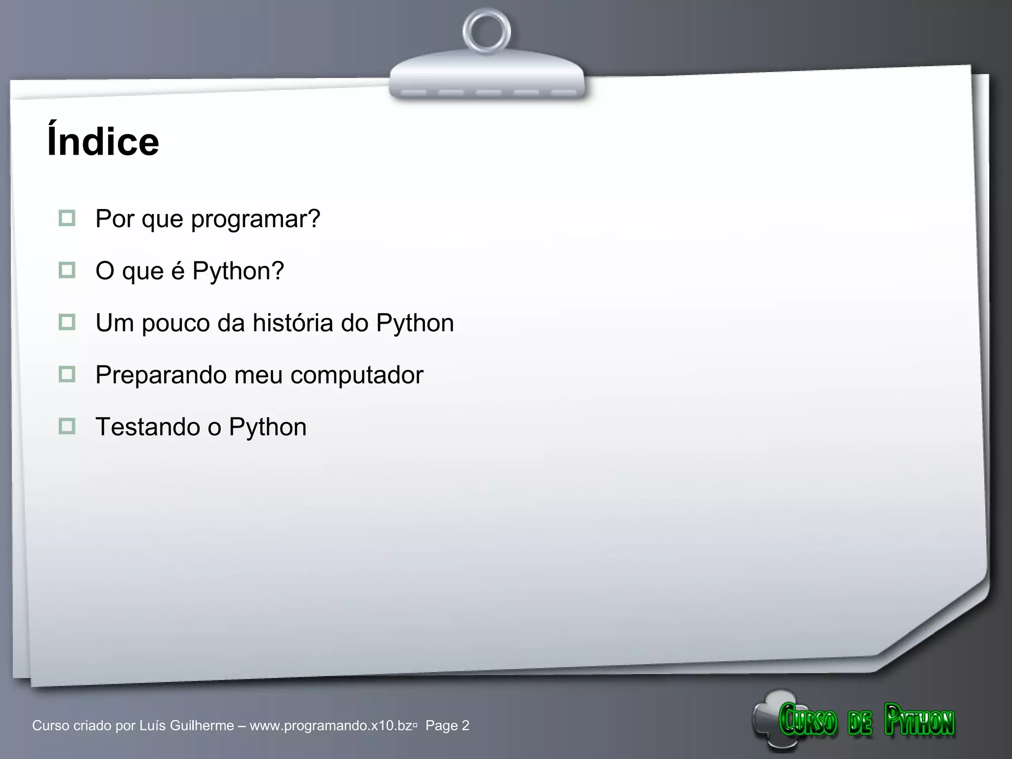 O documento fornece uma introdução sobre Python, incluindo sua história, características e como instalá-lo. Resume os principais pontos sobre o que é Python, como uma linguagem de programação interpretada e orientada a objetos, e como preparar o computador para uso do Python fazendo o download e testando a instalação.
