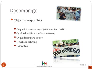 Este documento resume um curso sobre desemprego ministrado em fevereiro de 2014. Apresenta os objetivos do curso como explicar o que é desemprego, as condições para receber benefícios, a duração dos benefícios e como obtê-los. Também discute deveres, sanções e conceitos relacionados a desemprego de acordo com o Decreto-Lei n. 220/2006.