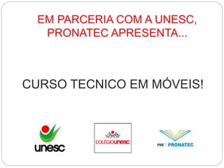 O documento anuncia um curso técnico em móveis oferecido em parceria com a UNESC que fornece uma estrutura universitária, biblioteca e aulas práticas para projetar, construir e fazer a diferença, transformando sonhos em realidade com reconhecimento garantido.