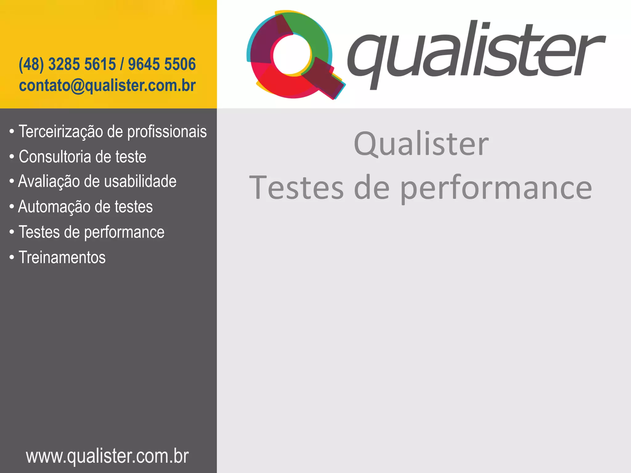 O documento fornece informações sobre os serviços de uma empresa de testes de software chamada Qualister, incluindo terceirização de profissionais, consultoria de teste, avaliação de usabilidade, automação de testes, testes de performance e treinamentos. Além disso, fornece detalhes de contato e links para o site da empresa.