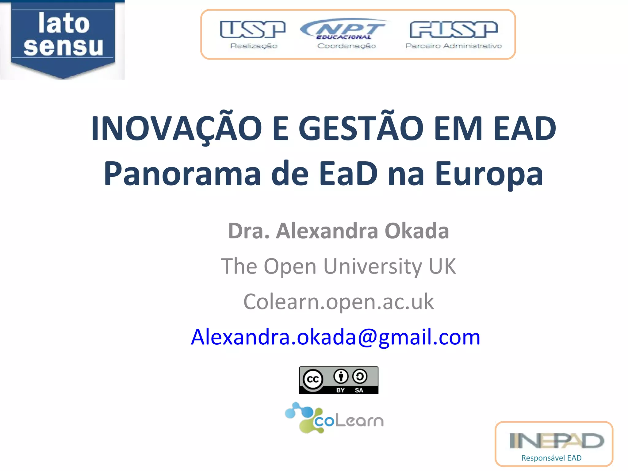 O documento discute a educação a distância aberta na Europa, com foco na Universidade Aberta do Reino Unido. Apresenta breve histórico da educação a distância na Europa desde o século XIX, destacando a Universidade Aberta do Reino Unido como uma das instituições pioneiras na área. Também aborda conceitos como coaprendizagem, recursos educacionais abertos e redes de pesquisa colaborativa como a COLEARN.