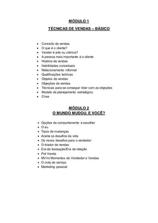 O documento discute técnicas básicas e avançadas de vendas em 5 módulos. O Módulo 1 cobre conceitos básicos como cliente, habilidades de vendas e objeções. O Módulo 2 trata de adaptação a mudanças e relacionamentos. O Módulo 3 foca em atendimento e qualidade ao cliente. O Módulo 4 apresenta mandamentos para vender. O Módulo 5 trata de estratégias avançadas para superar crises.
