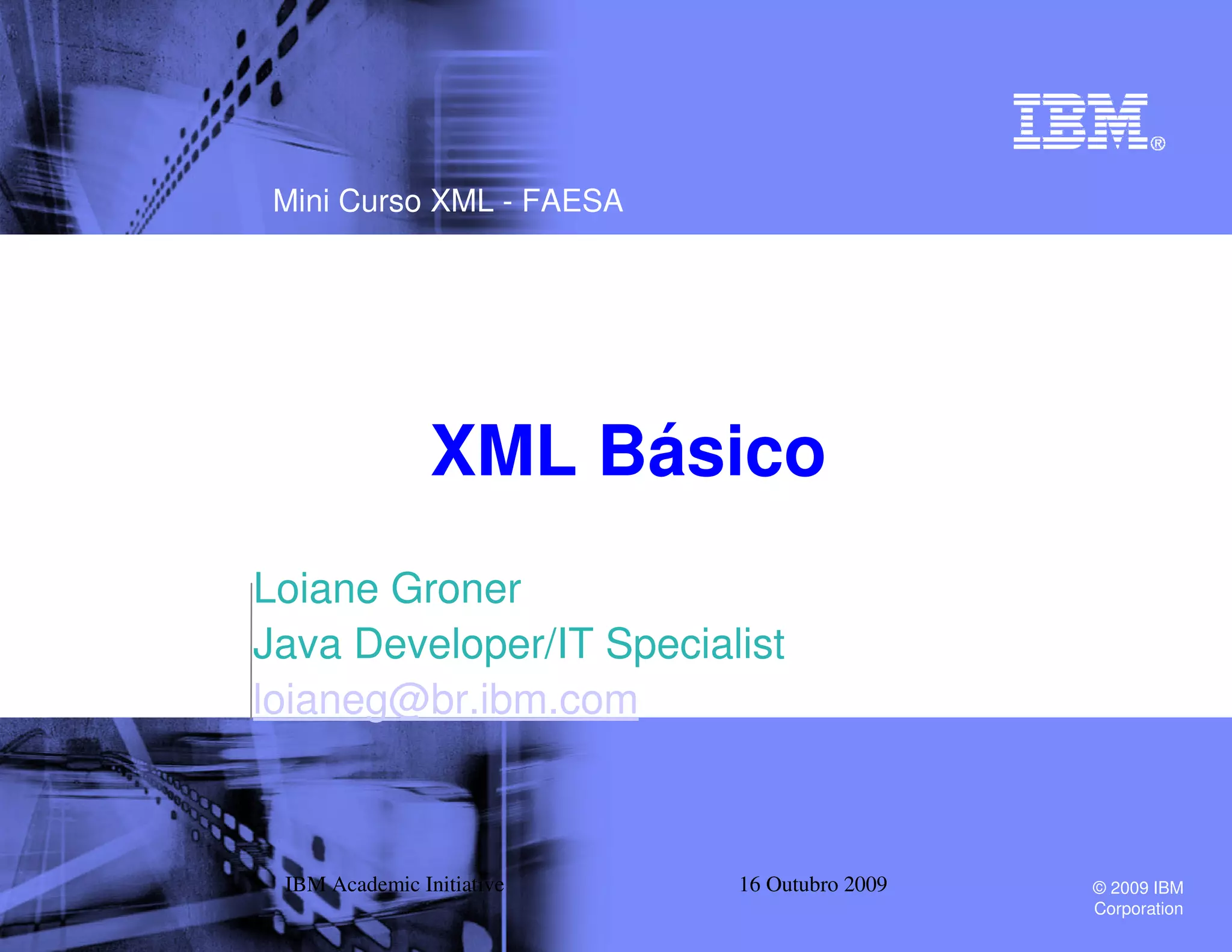 O mini curso XML da IBM, apresentado por Loiane Groner, aborda os fundamentos do XML, sua estrutura, e suas aplicações na manipulação de dados. O conteúdo inclui comparação com HTML, maneiras de validação de documentos XML, e instruções sobre a criação de documentos bem formados, além da importância de usar DTD para definição de elementos. O curso também discute quando evitar o uso de XML e apresenta boas práticas para construção e manipulação de documentos XML.