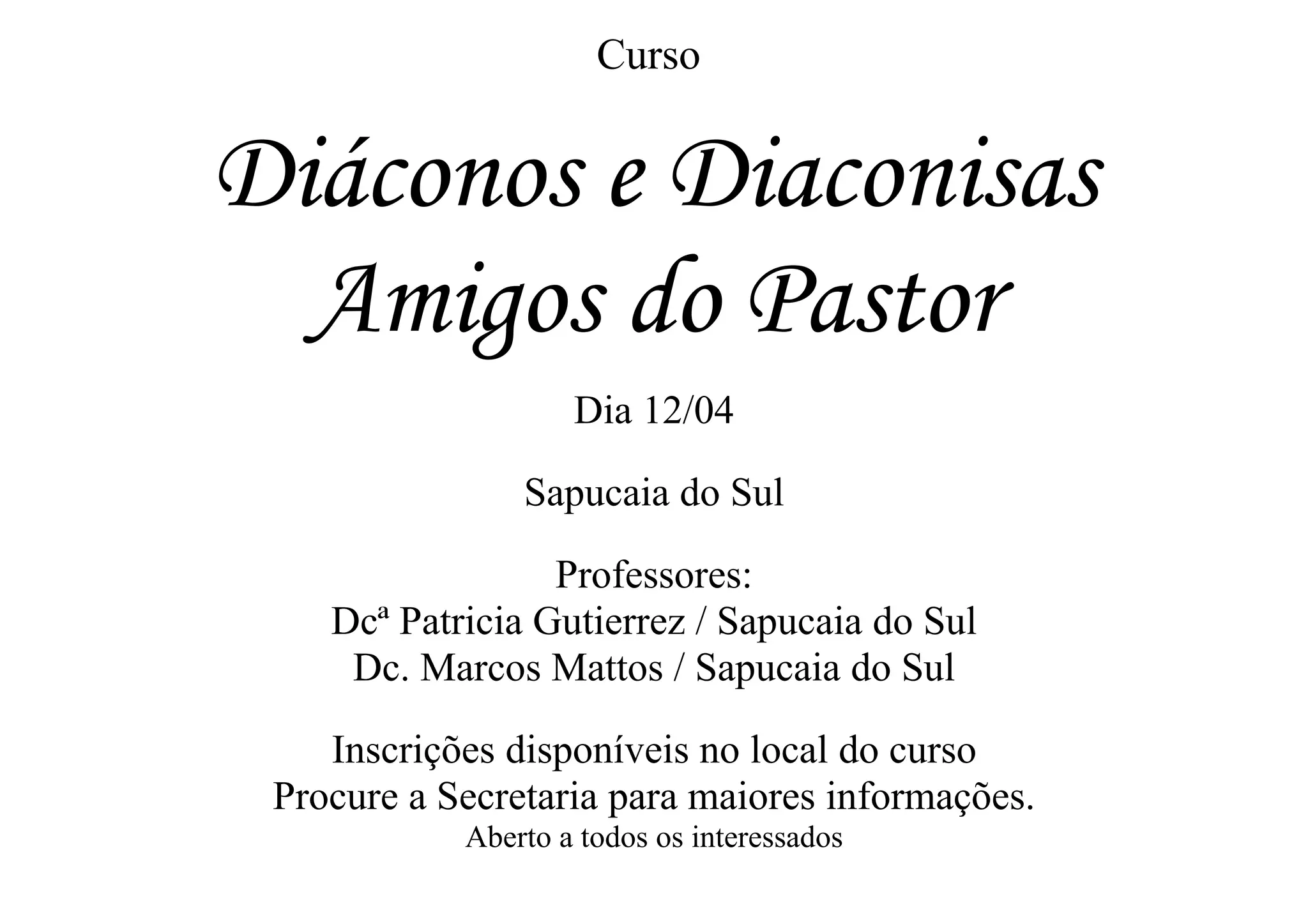Curso para diáconos e diaconisas realizado em Sapucaia do Sul no dia 12 de abril ministrado pelos professores Dca Patricia Gutierrez e Dc. Marcos Mattos com inscrições disponíveis no local do evento.
