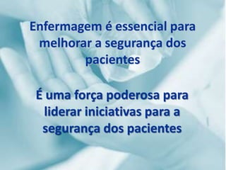 O documento discute o papel crucial das enfermeiras na promoção da segurança do paciente. Ele destaca que as enfermeiras são agentes-chave para liderar iniciativas de segurança do paciente e implementar ações comprovadas para reduzir eventos adversos. No entanto, muitos desafios institucionais e culturais dificultam esses esforços, como a falta de mudança cultural e sistemas inadequados. É necessária uma liderança forte e uma cultura de aprendizado para criar um ambiente seguro para os pacientes.