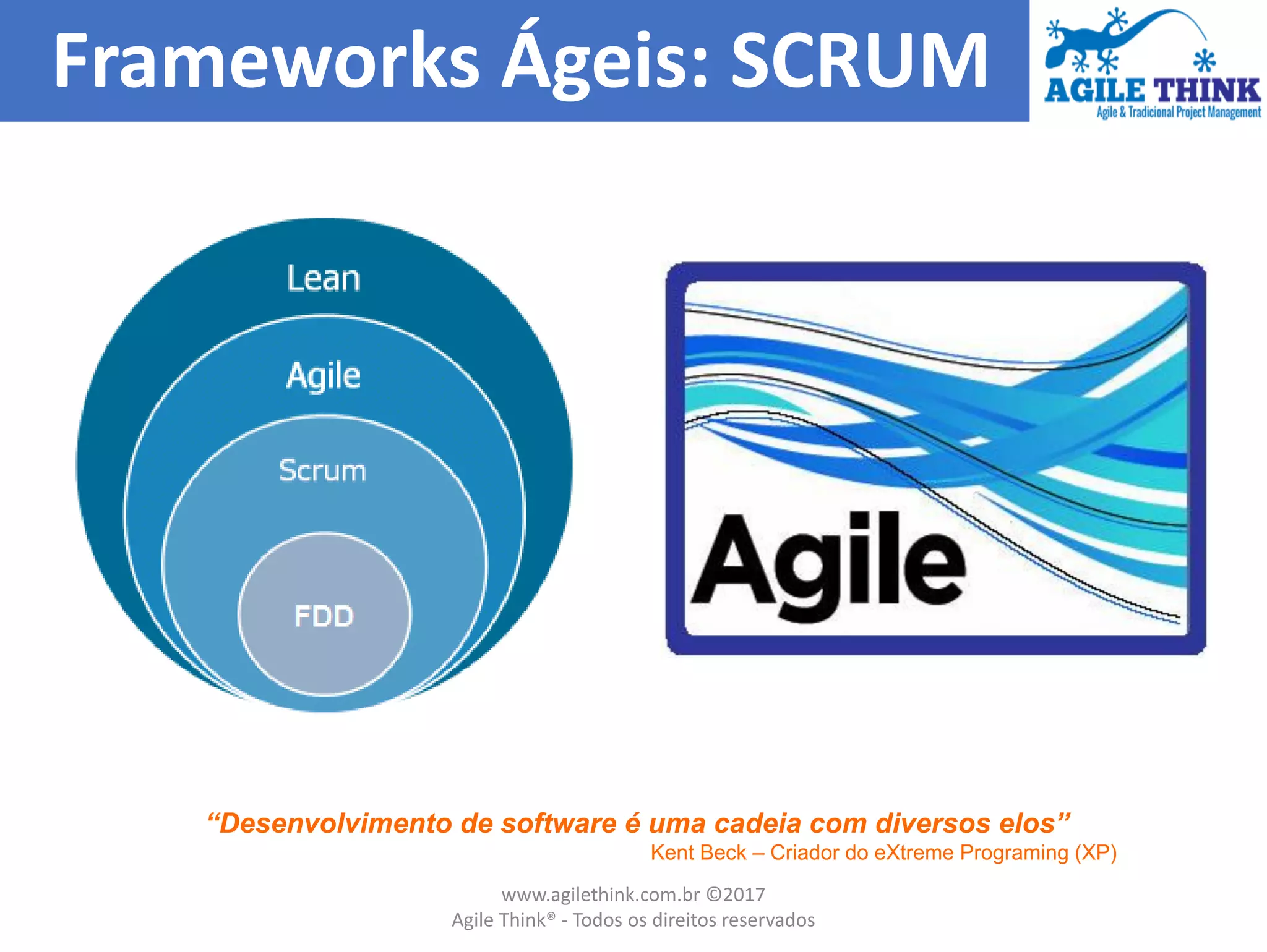 O documento repete várias vezes o site www.agilethink.com.br e a frase "Agile Think® - Todos os direitos reservados", sugerindo ser uma página sobre frameworks ágeis que destaca SCRUM e cita Kent Beck, criador do eXtreme Programing (XP).