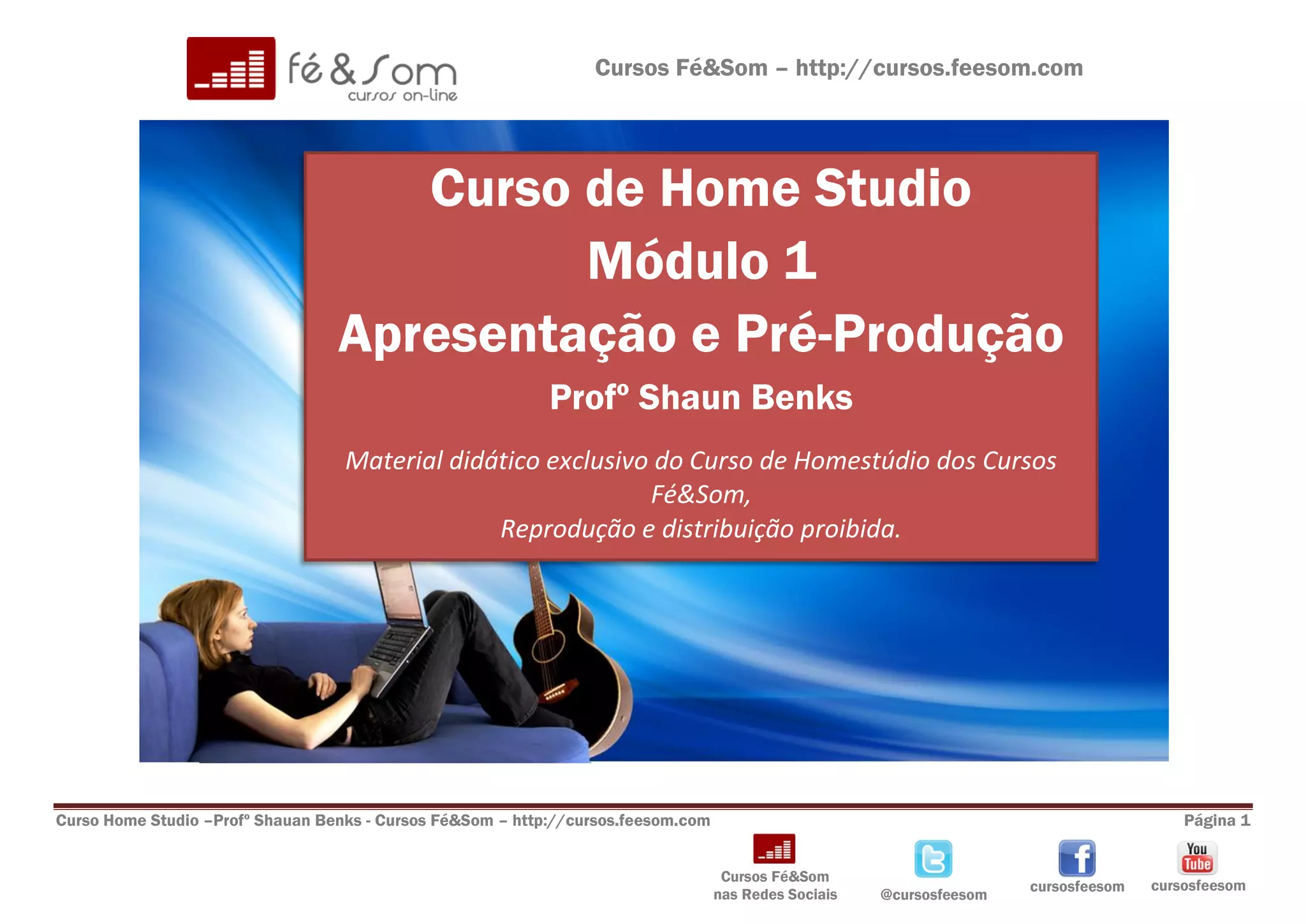 O documento apresenta um curso sobre home studio, abordando tópicos como a evolução dos estúdios, a importância de definir objetivos, planejamento e organização de um home studio, além das etapas do processo de produção musical como composição, gravação e mixagem.