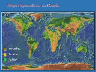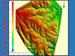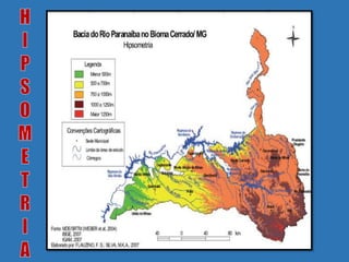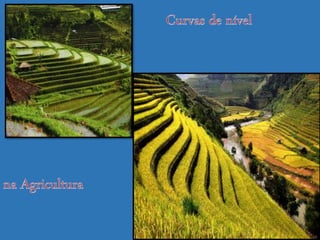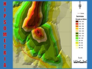 Curvas de nível são linhas que conectam pontos de mesma altitude e são usadas em mapas topográficos para representar o relevo de uma região. Elas são equidistantes e não podem se sobrepor, permitindo interpretar a inclinação do terreno. Mapas hipsométricos usam cores diferentes para representar diferentes altitudes.