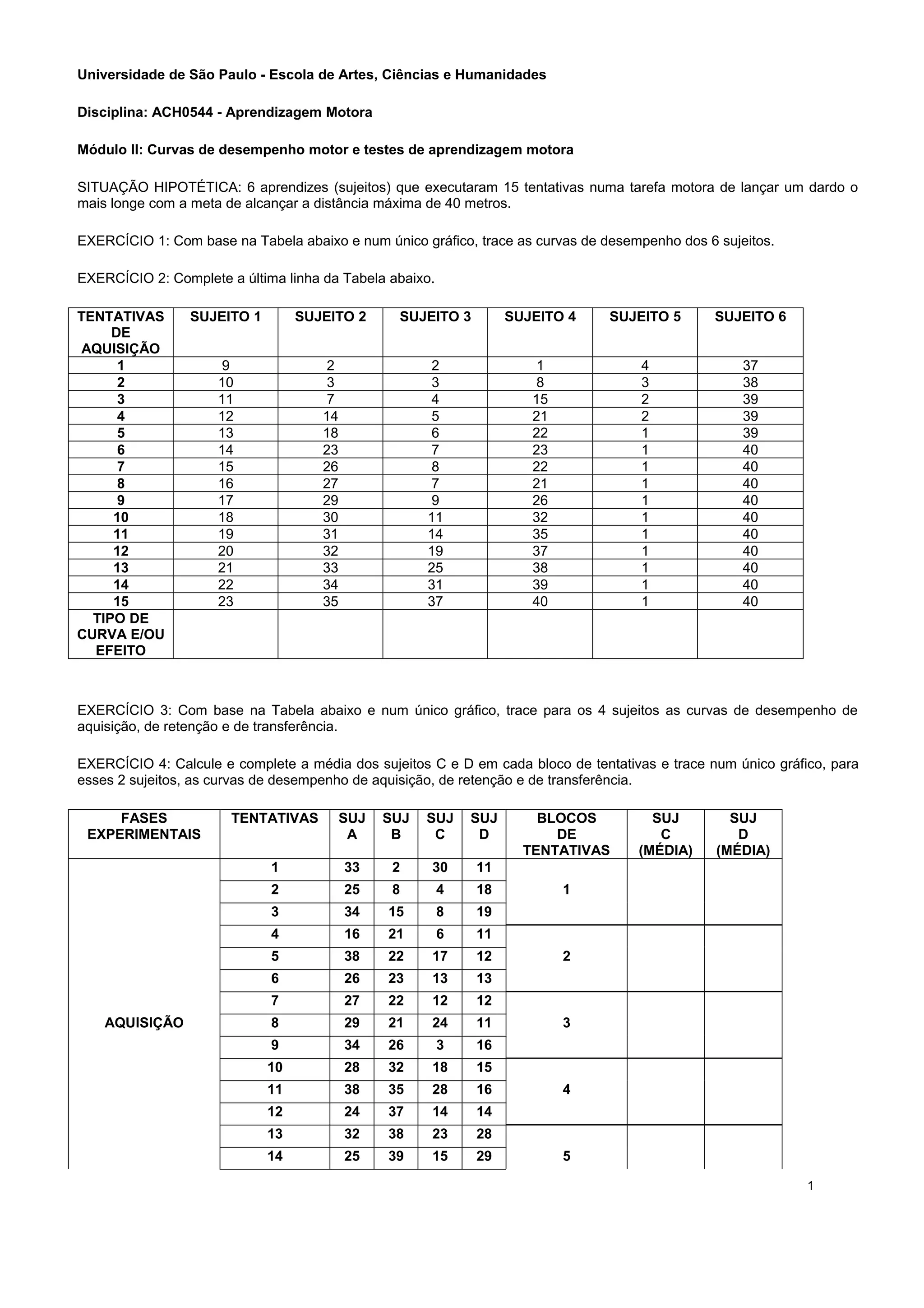 O documento descreve um estudo sobre aprendizagem motora que avaliou 6 aprendizes em uma tarefa de lançar dardos. Os exercícios pedem para traçar curvas de desempenho com base nos dados de 15 tentativas de cada aprendiz, calcular médias, e traçar curvas de aquisição, retenção e transferência para 4 sujeitos.