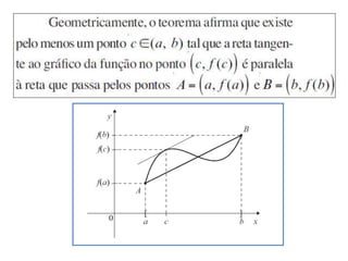 O texto define limites de funções de forma intuitiva e por meio de símbolos, apresenta noções sobre derivadas, incluindo a taxa de variação instantânea e a condição de derivabilidade. Também aborda teoremas como o do valor médio e do valor extremo, importantes para a otimização de funções.