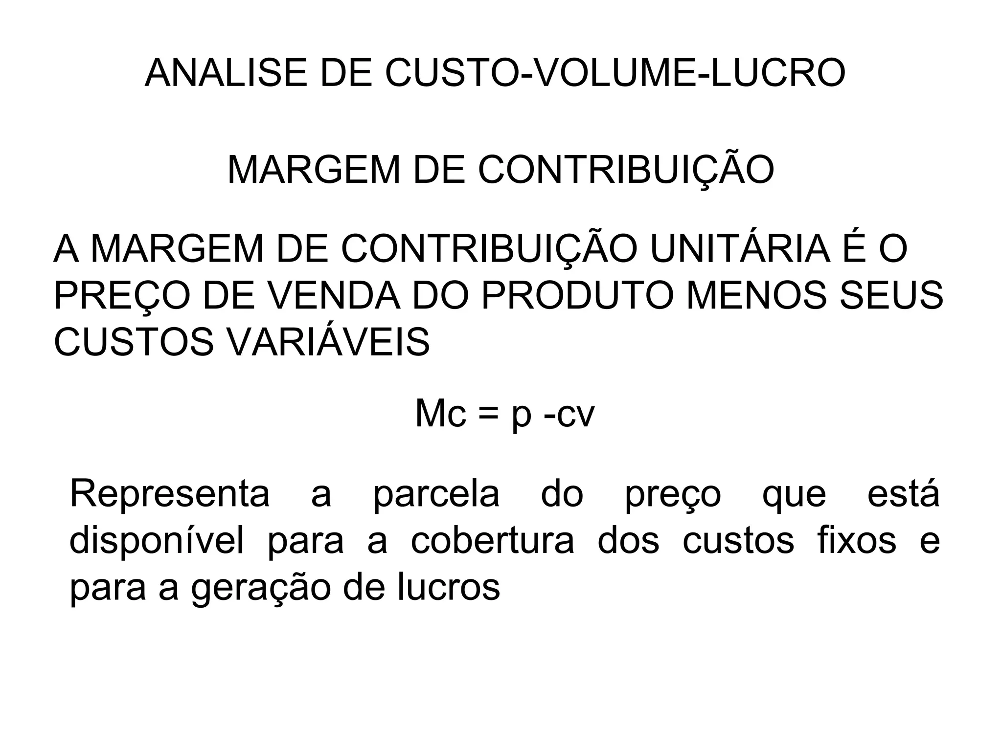 ANALISE DE CUSTO-VOLUME-LUCRO  MARGEM DE CONTRIBUIÇÃO A MARGEM DE CONTRIBUIÇÃO UNITÁRIA É O PREÇO DE VENDA DO PRODUTO MENOS SEUS CUSTOS VARIÁVEIS  Mc = p -cv Representa a parcela do preço que está disponível para a cobertura dos custos fixos e para a geração de lucros