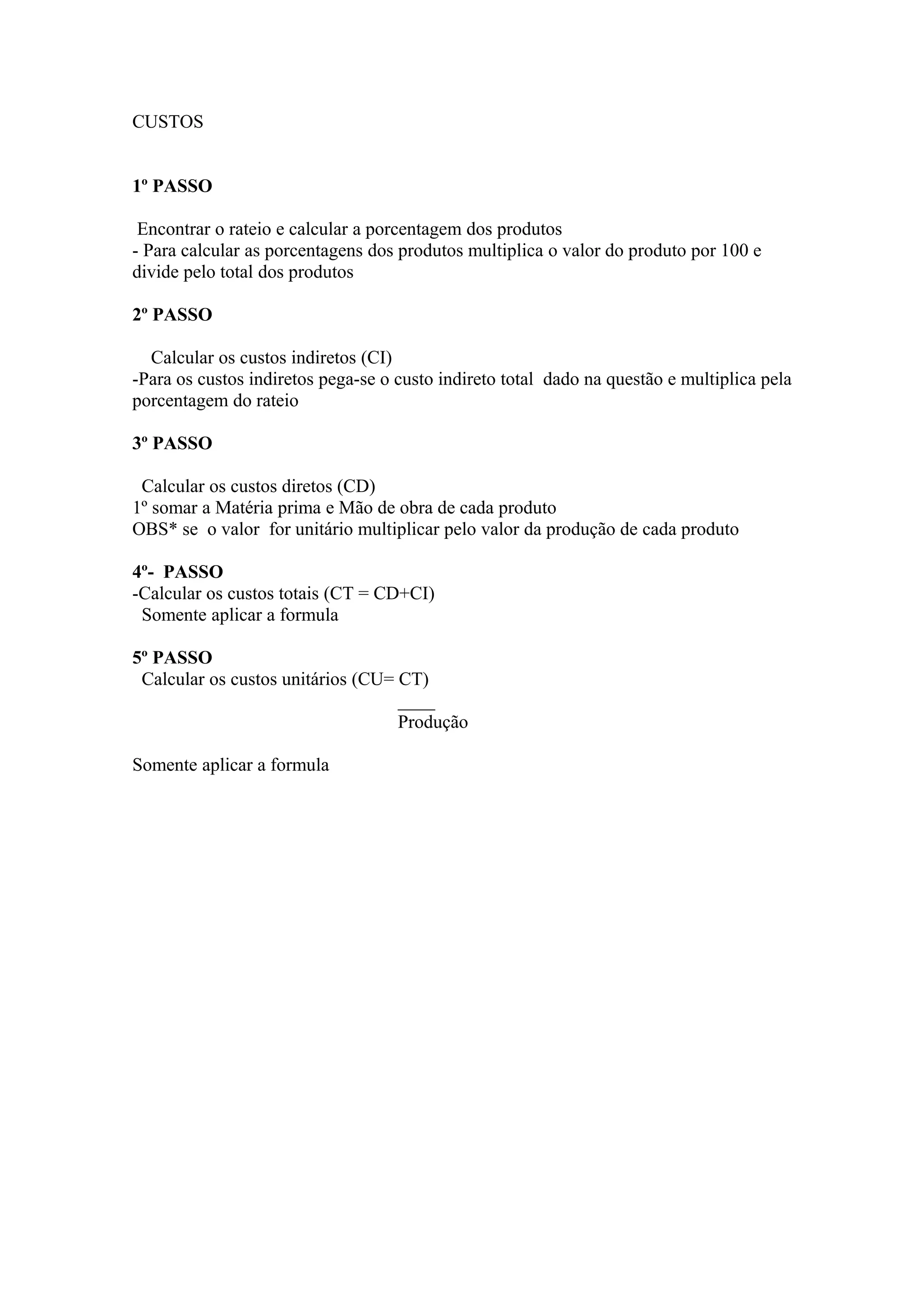 O documento descreve os 5 passos para calcular custos: 1) calcular porcentagens dos produtos, 2) calcular custos indiretos multiplicando o total por cada porcentagem, 3) somar matéria-prima e mão-de-obra ou valores unitários pela produção para custos diretos, 4) somar custos diretos e indiretos para custos totais, 5) dividir custos totais pela produção para custos unitários.