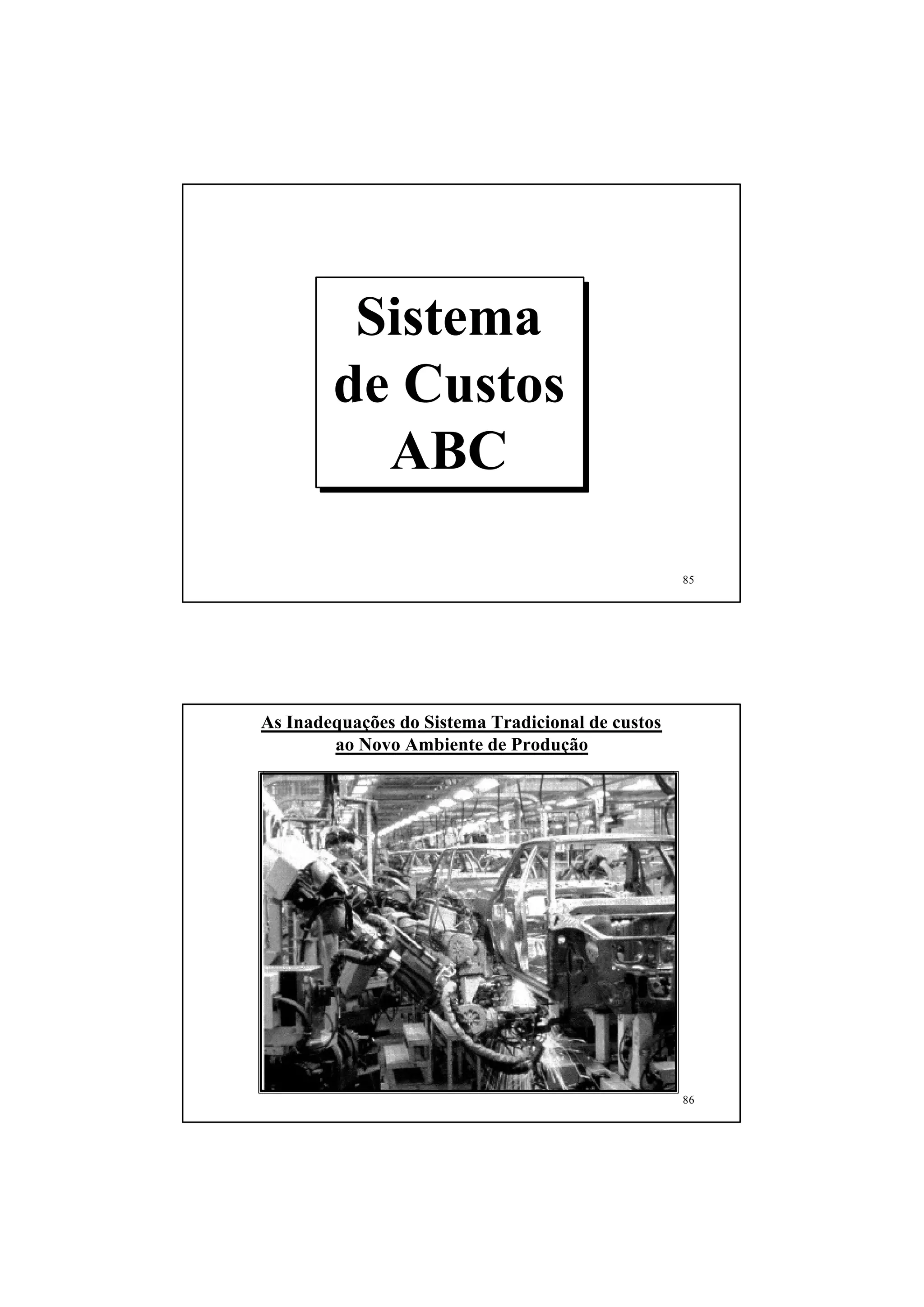 O documento discute o sistema de custos tradicional e suas limitações para o novo ambiente de produção, e introduz o sistema de custos baseado em atividades (ABC) como uma alternativa capaz de superar essas limitações. O ABC permite a alocação de custos indiretos de forma mais precisa, considerando os direcionadores de atividades que causam os diferentes níveis de consumo de recursos. Um exemplo numérica ilustra como o ABC pode produzir informações mais úteis para tomada de decisões do que o sistema tradicional.