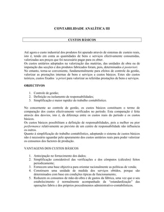 1) O documento discute os custos básicos, especialmente os custos-padrão, que são custos teóricos estabelecidos para valorizar prestações internas de bens e serviços.