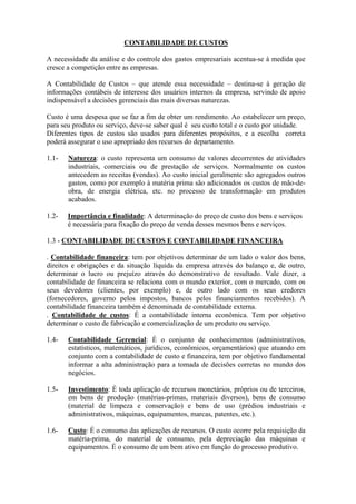 1) A contabilidade de custos é importante para analisar gastos e controlar custos, apoiando decisões gerenciais. Ela gera informações sobre o custo de produção de bens e serviços para fixação de preços.