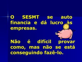 O documento discute os custos dos acidentes de trabalho para as empresas versus os benefícios econômicos do Sistema de Segurança e Saúde no Trabalho (SESMT). Ele destaca que o SESMT se paga e gera lucro, mas as empresas ainda não percebem isso. Também mostra dados sobre gastos da Previdência Social com acidentes e os altos custos que acidentes representam para a sociedade e empresas.