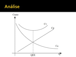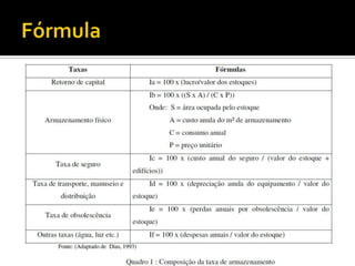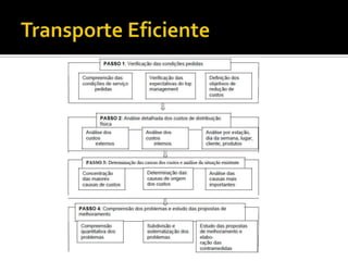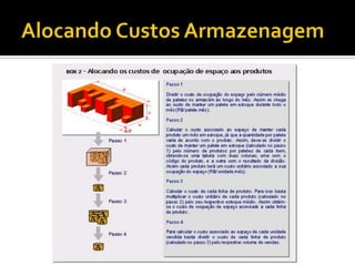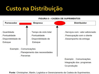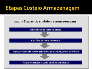 O documento discute diversos aspectos relacionados aos custos logísticos, como: (1) os custos logísticos representam um tipo significativo de custo para as empresas; (2) é importante o tomador de decisão conhecer as limitações dos modelos de custos; (3) a terceirização da logística pode ser uma alternativa para reduzir custos.