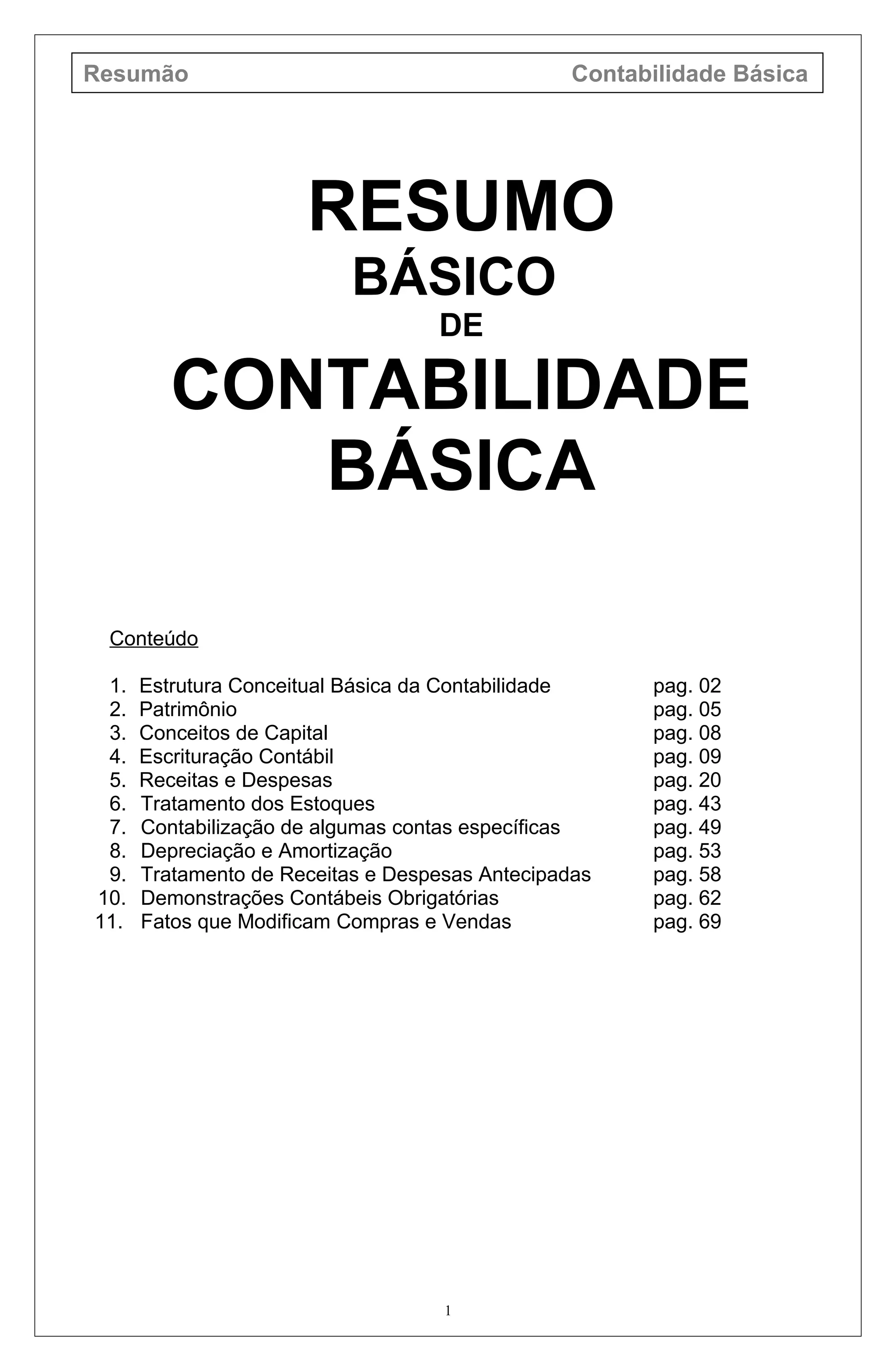 1. O documento resume os principais conceitos básicos de contabilidade, incluindo a estrutura conceitual, patrimônio, capital, escrituração contábil e outros tópicos.