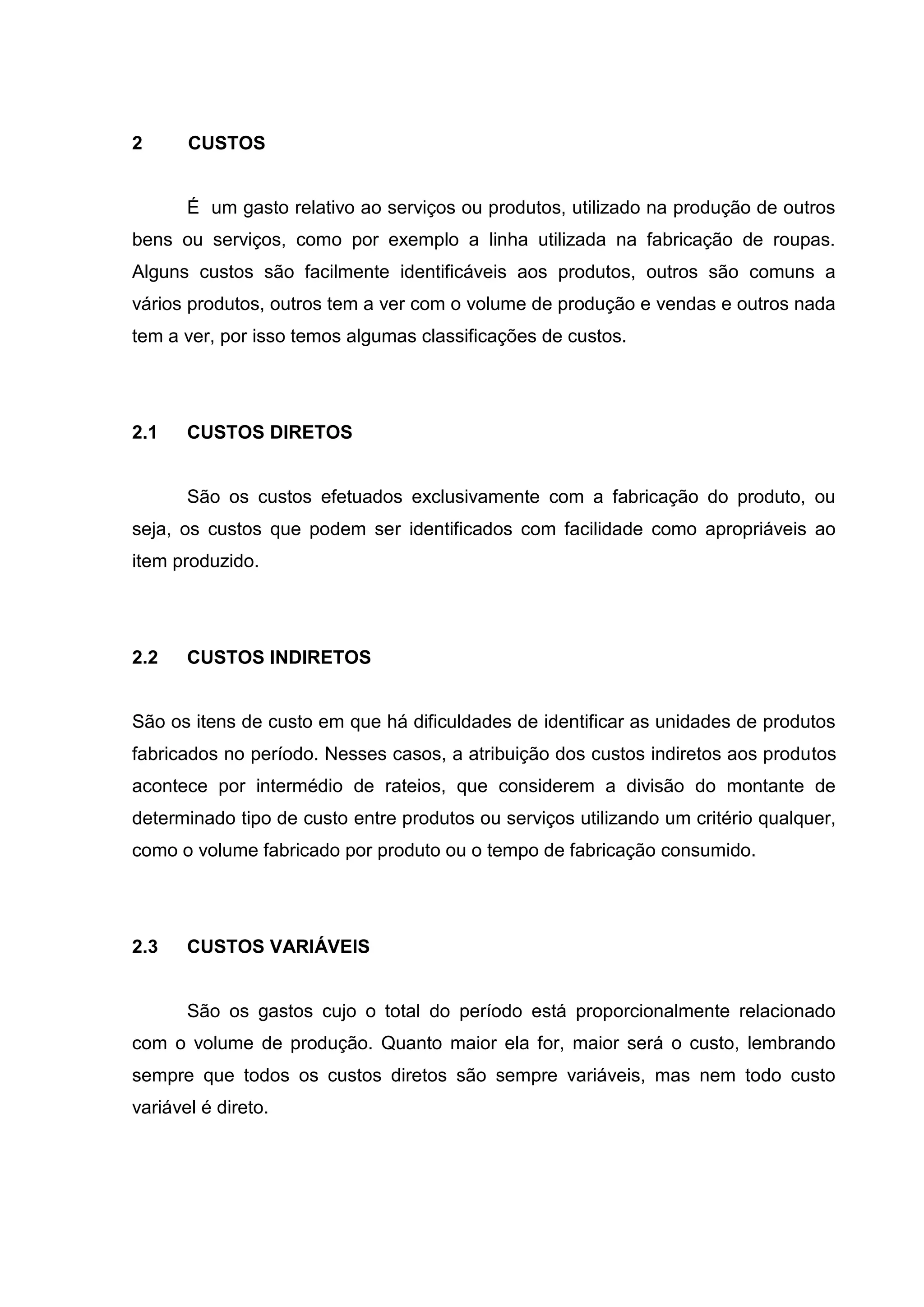 O documento discute os conceitos de custos, despesas, gastos e investimentos na administração e contabilidade de empresas. Custos incluem diretos, indiretos, variáveis e fixos. Despesas são gastos administrativos que não afetam lucros e perdas. Gastos envolvem desembolsos para bens e serviços. Investimentos são gastos ativados que geram benefícios futuros.