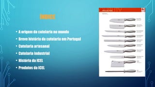 O documento descreve a história da indústria de cutelaria ICEL em Portugal. Começou como uma pequena oficina familiar na década de 1940 produzindo cutelaria manualmente. Em 1945, tornou-se numa sociedade chamada Indústria de Cutelarias da Estremadura, produzindo facas de carbono. Atualmente, a ICEL produz uma variedade de produtos de cutelaria em larga escala usando maquinaria moderna.