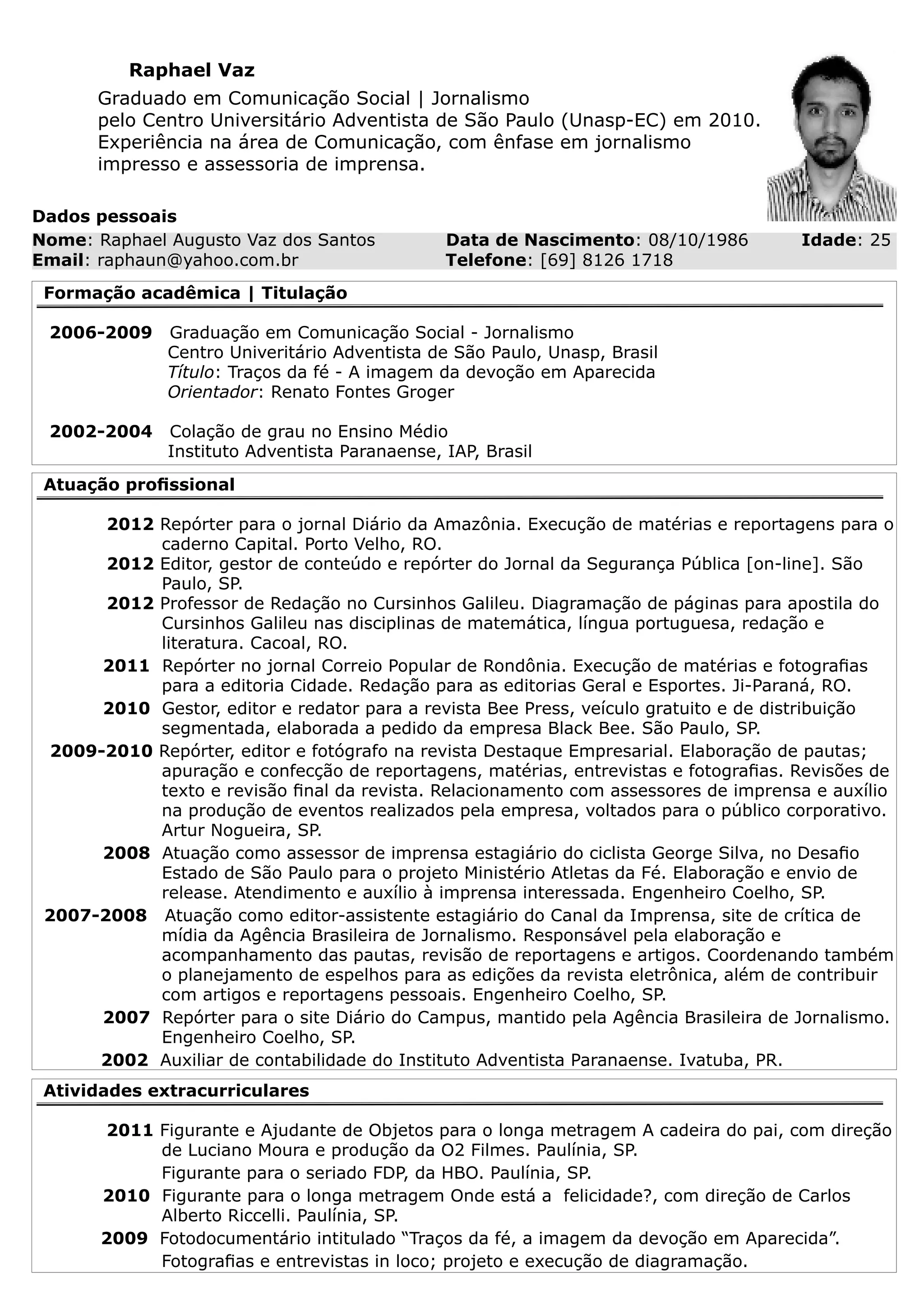 Raphael Vaz graduou-se em Comunicação Social/Jornalismo em 2010 e possui experiência em jornalismo impresso e assessoria de imprensa. Seu currículo inclui estágios e trabalhos como repórter, editor e professor. Ele também tem certificados em liderança e mailing de imprensa.