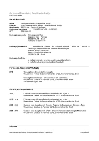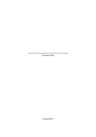 Este currículo resume a formação acadêmica e experiência profissional de Jeremias Dinamérico Serafim de Araújo. Ele possui graduação em Ciência da Computação pela UFCG de 2010 e iniciou graduação em Licenciatura em Matemática pela UEPB em 2008. Jeremias também participou de eventos acadêmicos e cursos de inglês e espanhol.
