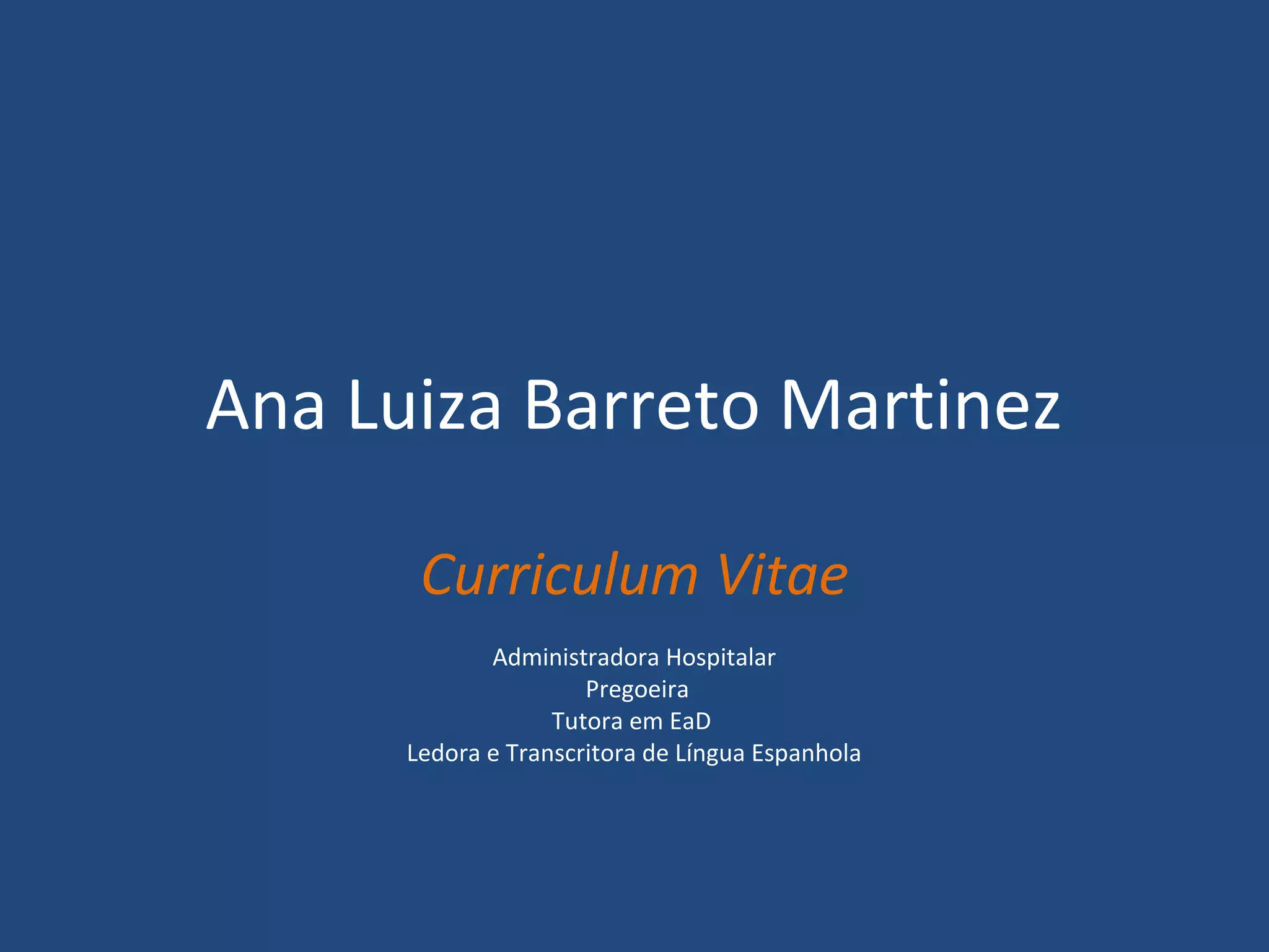 O documento resume o currículo de Ana Luiza Barreto Martinez, que tem experiência em administração hospitalar, coordenação de equipes de saúde, faturamento, logística, organização e métodos, cursos a distância, licitações e comissões. Ela possui formação acadêmica em Artes Plásticas e Administração Hospitalar, além de diversos cursos complementares nas áreas de saúde, educação a distância e licitações.