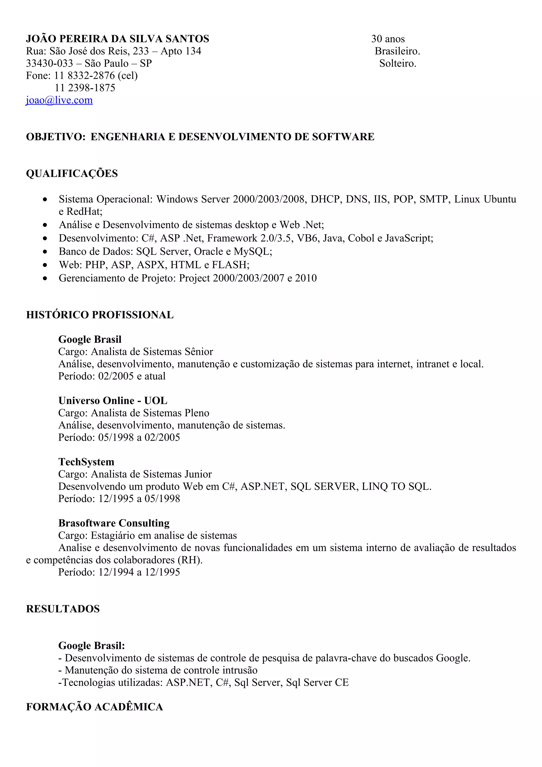 João Pereira da Silva Santos é um engenheiro de computação de 30 anos com experiência em análise, desenvolvimento e manutenção de sistemas para a internet, intranet e desktop usando tecnologias como C#, ASP.NET, SQL Server, Oracle e MySQL. Seu objetivo é trabalhar com engenharia e desenvolvimento de software.