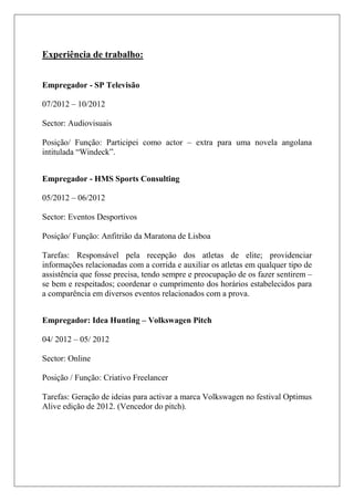 Este documento resume o currículo de Joao Santiago, incluindo sua educação na área de comunicação, experiência de trabalho em televisão, eventos esportivos e agências de publicidade, e habilidades como comunicação, trabalho em equipe e criatividade para resolver problemas.