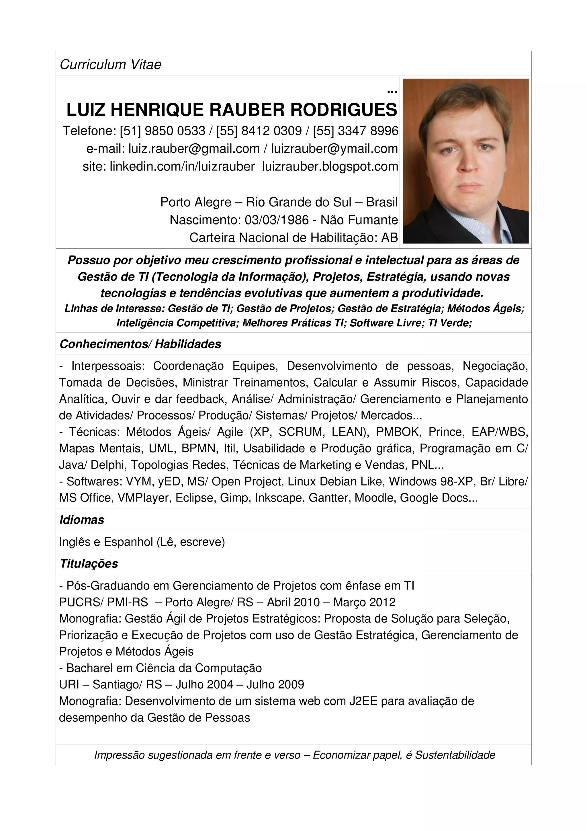 O currículo apresenta as qualificações profissionais de Luiz Henrique Rauber Rodrigues, incluindo sua formação acadêmica em Ciência da Computação e pós-graduação em Gerenciamento de Projetos. Ele possui experiência em consultoria de TI, projetos ágeis, software livre e gestão empresarial, tendo trabalhado para startups, empresas de agronegócio e automóveis. Seu objetivo é o crescimento profissional nas áreas de gestão de TI, projetos e estratégia.