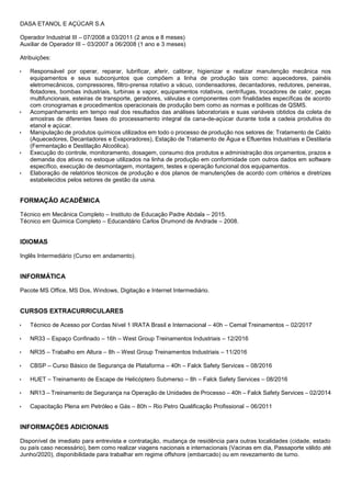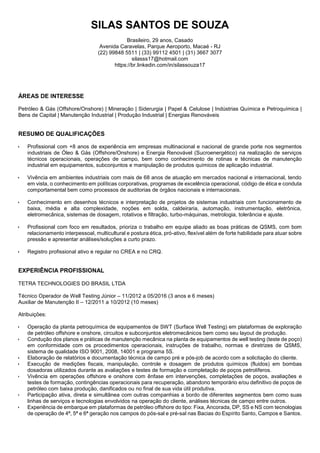 Silas Santos de Souza é um profissional brasileiro de 29 anos com mais de 8 anos de experiência em empresas de petróleo e gás e energia renovável. Ele tem experiência em operações de campo, manutenção industrial e processos químicos. Seu objetivo é uma posição em indústrias como petróleo e gás, mineração, siderurgia ou energia renovável.