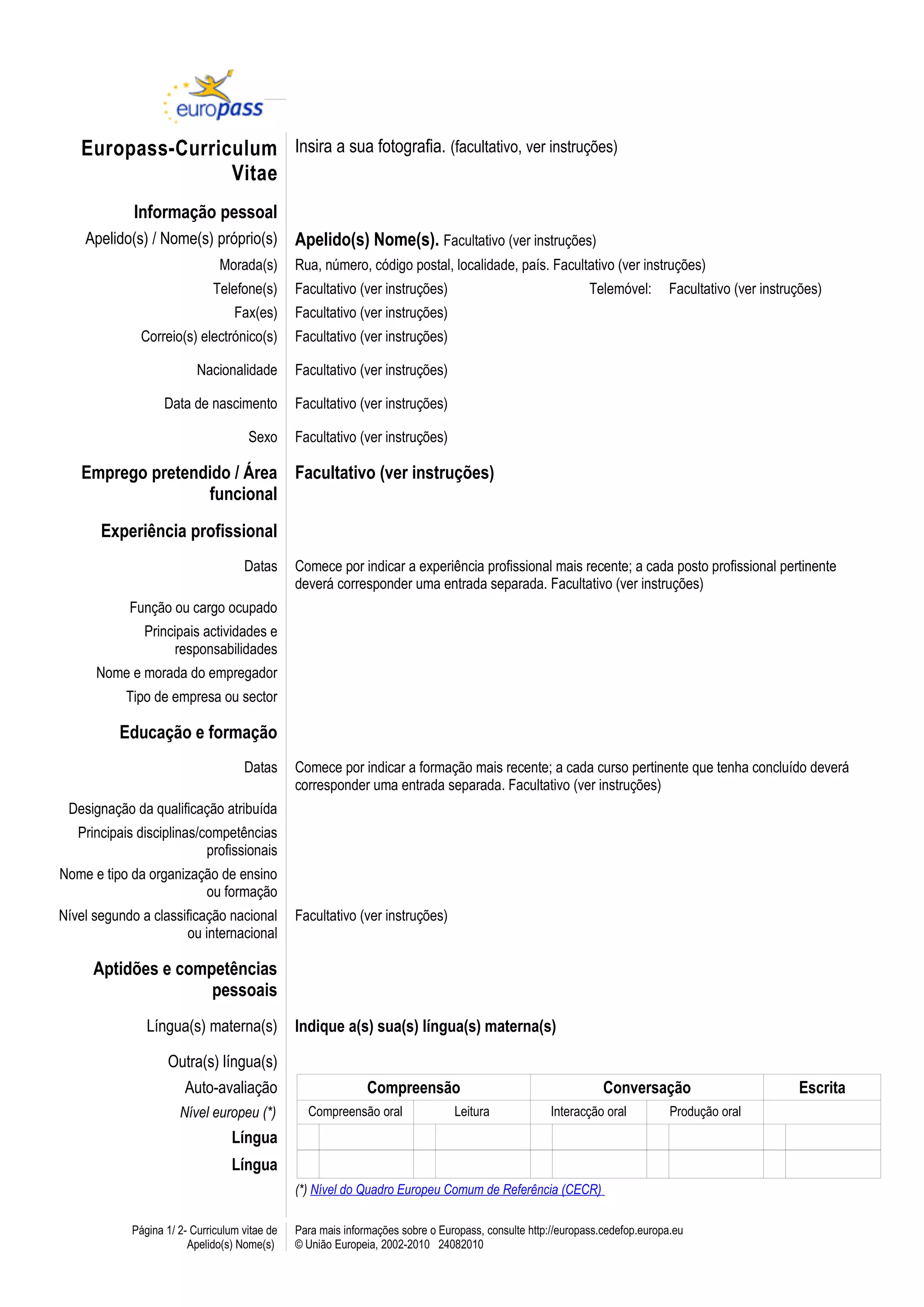 Este documento é um currículo Europass que fornece informações pessoais e profissionais de um indivíduo. Ele inclui detalhes como nome, endereço, telefone, experiência de trabalho, educação, habilidades linguísticas e competências pessoais. O currículo segue o formato padrão do Europass para facilitar a compreensão internacional.