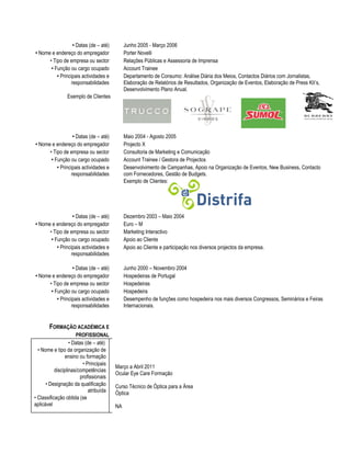 Este currículo resume a experiência profissional e formação acadêmica de Carla Mourão Martins da Costa. Ela tem mais de 10 anos de experiência em marketing e gestão, tendo trabalhado em ópticas, tecnologia, relações públicas e consultoria. Sua formação inclui uma licenciatura em marketing, publicidade e relações públicas.