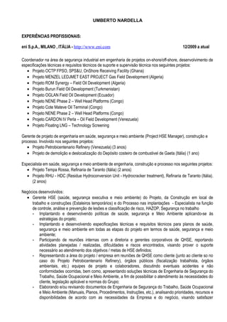 Umberto Nardella tem 8 anos de experiência em saúde, segurança e meio ambiente em projetos de engenharia no setor de óleo e gás, atuando nos últimos 3 anos como Gerente de HSE. Ele coordenou equipes de engenheiros especializados e atualmente trabalha na eni S.p.A., fornecendo suporte técnico em projetos offshore e onshore internacionais. Nardella possui mestrado em engenharia ambiental e experiência anterior na Techfem S.p.A. e Renco Kat.
