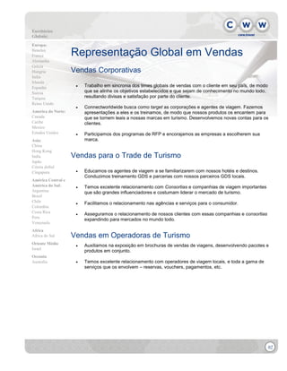 A empresa Connect Worldwide oferece serviços globais de vendas, marketing e relações públicas para marcas hoteleiras, destinos e serviços turísticos. Sua visão é ser reconhecida como referência nesses serviços e sua missão é promover crescimento nas vendas e reconhecimento das marcas de seus clientes em todo o mundo por meio de uma rede global de escritórios.