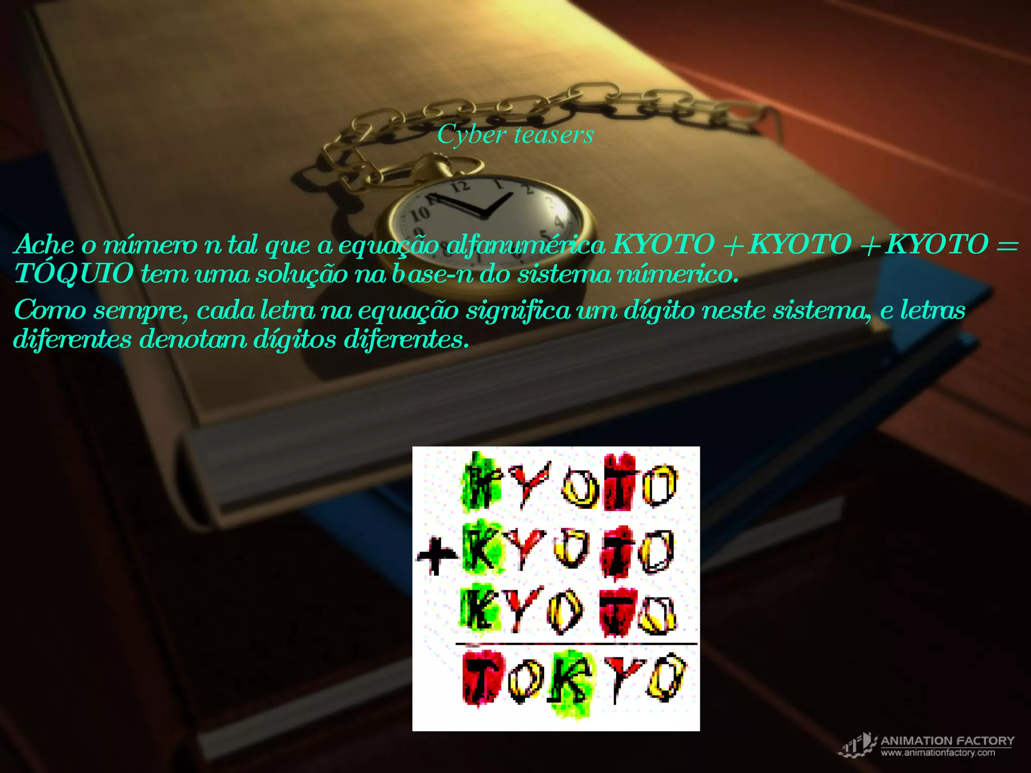 Cyber teasers Acheo número n tal que a equação alfanumérica KYOTO + KYOTO + KYOTO = TÓQUIO tem uma solução na base-n do sistema númerico. Como sempre, cada letra na equação significa um dígito neste sistema, e letras diferentes denotam dígitos diferentes.
