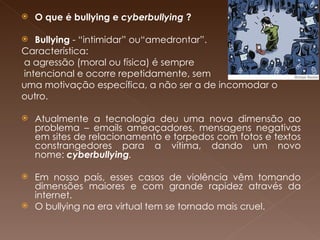 O documento discute o bullying e cyberbullying, definindo-os como agressões intencionais e repetidas contra outra pessoa sem motivação específica. Explica que o cyberbullying ocorre online através de mensagens, fotos ou vídeos constrangedores que podem ser vistos por muitas pessoas, ampliando a perseguição da vítima. Também lista sete tipos de cyberbullying que se enquadram em crimes como calúnia, difamação e injúria, e destaca a necessidade de conscientização e denúncias para lidar com o problema.