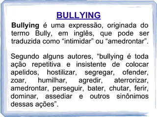 O documento discute o bullying e o cyberbullying, definindo-os e explicando seus participantes (vítima, agressor e platéia). O bullying envolve ações físicas ou psicológicas de humilhação, enquanto o cyberbullying ocorre online. Ambos podem causar danos sérios à saúde mental das vítimas. A conscientização e a denúncia são apontadas como formas de evitar esses problemas.