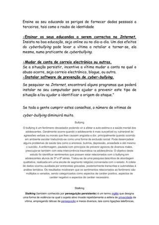 O documento discute cyberbullying, que envolve o uso de tecnologia para comportamentos hostis e repetidos com a intenção de prejudicar outra pessoa. Cyberbullying pode incluir ameaças, comentários ofensivos, ridicularização online ou divulgação de informações falsas para humilhar a vítima. É importante educar as pessoas sobre como evitar cyberbullying, manter a privacidade online e mudar contas ou instalar software de proteção caso seja vítima.
