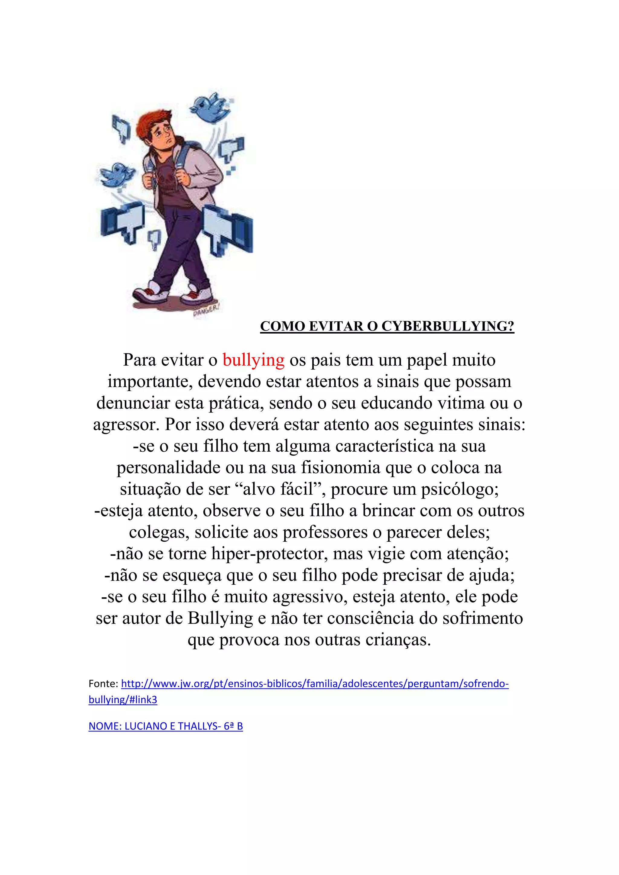 O documento fornece dicas para pais detectarem cyberbullying, incluindo observar sinais de vitimização ou agressão em seu filho, conversar com professores, não ser overprotetor, mas vigiar com atenção, e estar ciente se seu filho é agressivo e pode estar praticando bullying sem perceber.